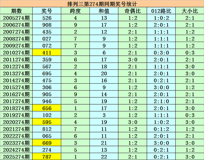 上期追思:摆列三第2025274期奖号为787,组选类型为组三,奖号大小比为3:0,012路比为0:2:1,奇偶比为2:1。